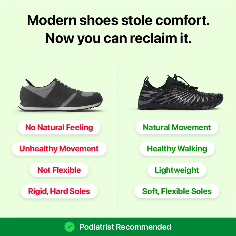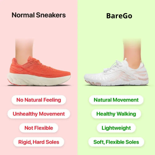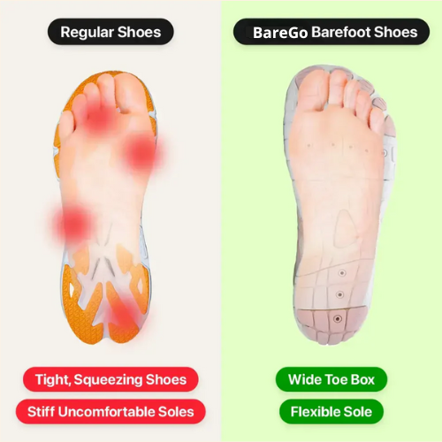Are your feet hurting? Regular shoes are too stiff and cause pain in your feet, legs, and back. BareGo shoes fix this problem fast. Their thin, flexible soles let your feet move naturally.